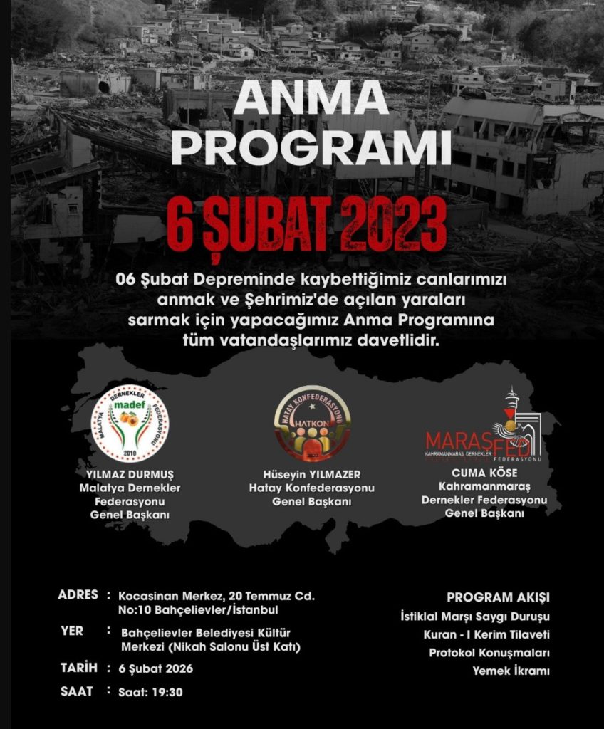 Üst kuruluşumuz Kahramanmaraş Dernekler Federasyonu (MARAŞFED), Malatya Dernekler Federasyonu (MADEF) ve Hatay Konfederasyonu (HATKON) iş birliğiyle düzenlenecek olan **”6 Şubat Anma Programı”**na tüm hemşehrilerimiz davetlidir.